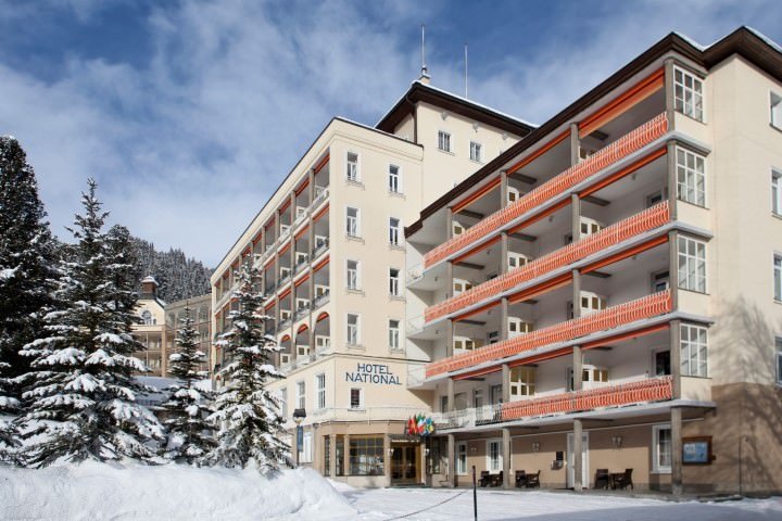 Poloha Komfortní 3hvězdičkový superior hotel National leží přímo v centru obce Davos Platz. Do nejbližšího lyžařského střediska Vás vyveze lanovka „Schatzalpbahn“, která se nachází cca 350 m od ubytování. Běžkařské trasy jsou vzdálené asi 200 m. Zastávka skibusu je cca 300 m od hotelu. K nádraží Davos Platz je to asi 400 m. K lanovce jezdí kyvadlová doprava. V okolí se nachází i Jakobshorn, jeden z oblíbených výletních cílů, kam se rozhodně stojí za to jet podívat, snadno se sem dostanete shuttle busem. K obchodům dorazíte přibližně po cca 300 m, k nejbližším kavárnám a restauracím přibližně po cca 230 m.