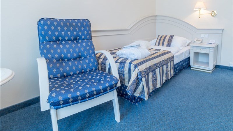 a) 1 a 2 – lůžkové pokoje SUPERIOR: Spr. nebo vana +WC, TV, telefon, minibar, rychlovarná konvice, sejf, fén, župan a pantofle, Wi-Fi. Výhled do ulice nebo do zadního traktu. ** b) 1 a 2 – lůžkové pokoje SUPERIOR PLUS:** Spr. nebo vana +WC, TV, telefon, minibar, rychlovarná konvice, sejf, fén, župan a pantofle, Wi-Fi. Výhled do parku a ke kolonádě.